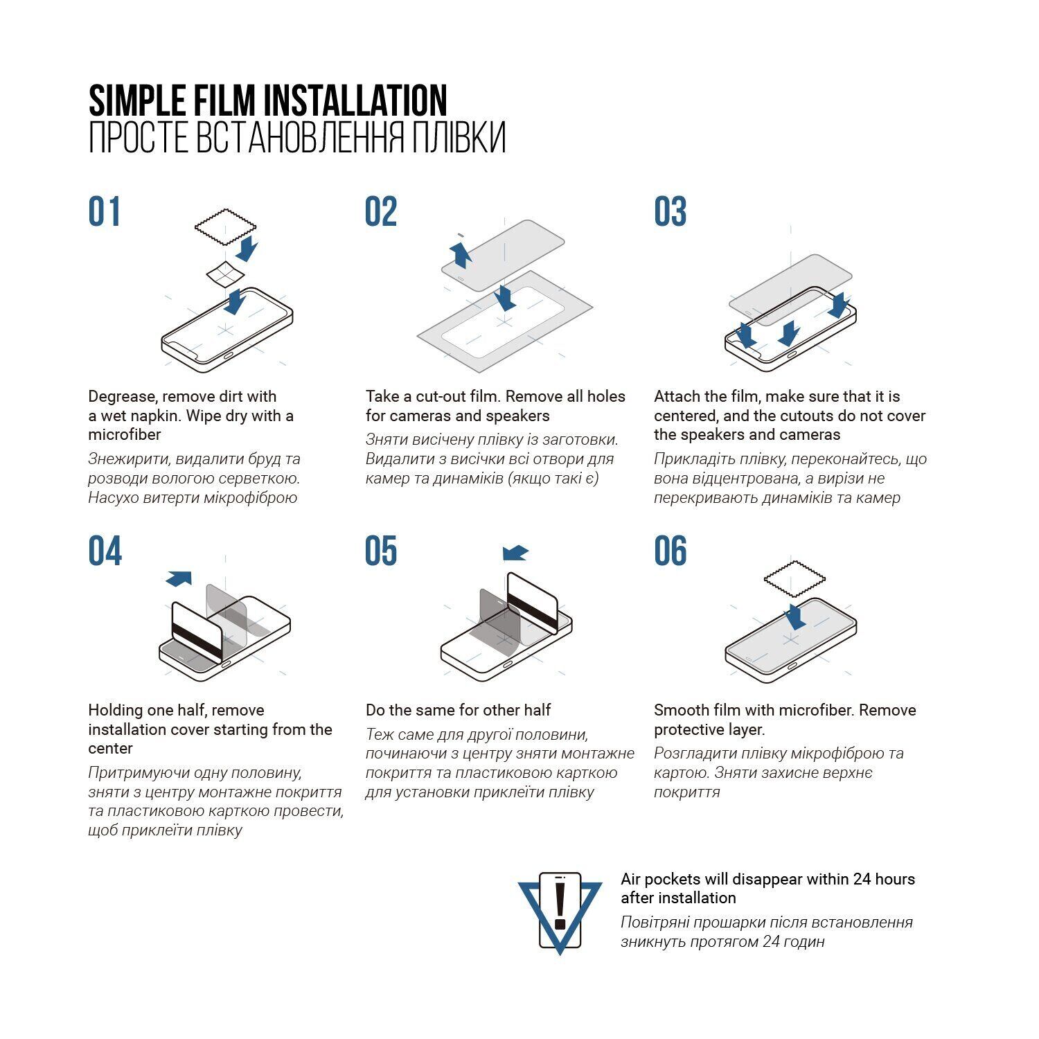 Зверніть увагу! Плівка буде відступати від краю фронтальної панелі на 1-2 мм. Дана особливість обумовлена скругленнями дисплея вашого смартфона і є "запасом" для використання чохла (щоб його край не піднімав / відклеював плівку)!