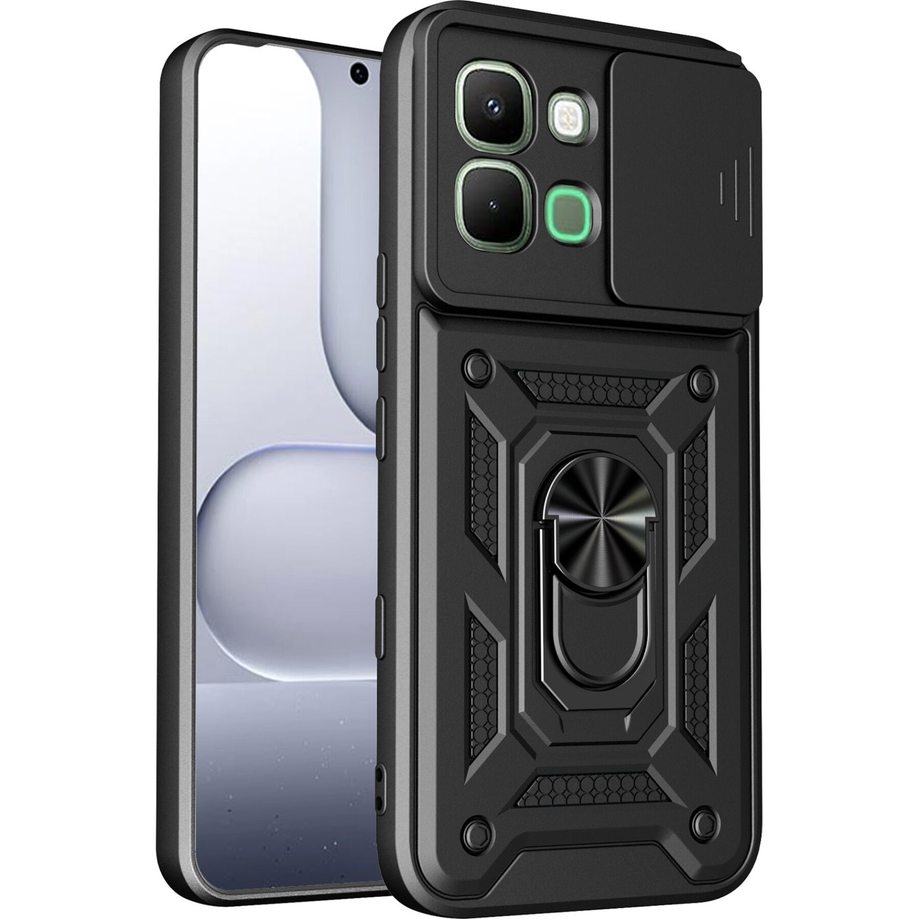 Чохол Deexe Armor Shield – це безкомпромісний захист вашого Infinix Note Edge від самих різних пошкоджень, що загрожують йому в процесі активного використання. В його основі лежить двокомпонентна структура з еластичної силіконової (TPU) накладки і міцного пластикового панцира: панцир приймає на себе основну силу удару у випадку падіння на підлогу, тоді як еластичний силікон розсіює залишкову енергію, мінімізуючи негативний вплив на смартфон. В чохлі передбачені всі необхідні отвори для вільного доступу до портів і камери, а також м'які дублікатори клавіш, що оберігають їх від забивання брудом. Для захисту камери додатково передбачена рухлива шторка, яка буде прикривати об'єктив, коли ви нею не користуєтеся. Також слід зазначити наявність металевого елемента з кільцем-тримачем на спинці, який може виконувати відразу три зручні функції: перш за все, надівши кільце на палець, можна впевнено утримувати пристрій в руці, не побоюючись випадково його впустити; по-друге, якщо відкинути кільце назад, вийде зручна підставка, яка полегшує перегляд відео або читання з екрану; ну і по-третє, металева основа кільця дозволяє вільно фіксувати пристрій на магнітній панелі автомобільного утримувача, без необхідності наносити спеціальну наклейку.