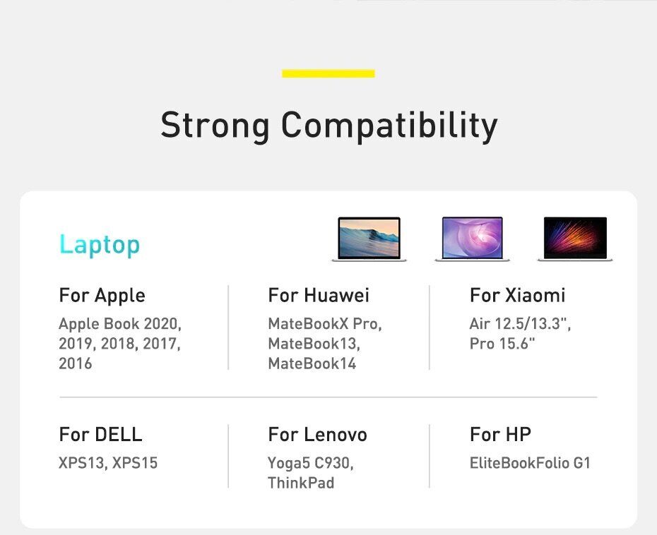 • Завдяки високому вольтажу та силі струму (20V/5A) здатний заряджати ноутбуки;