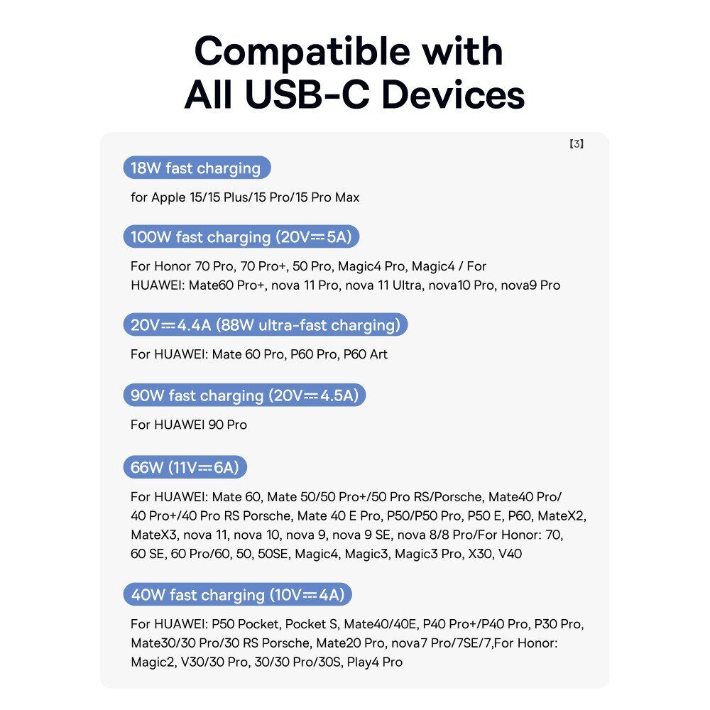 • Підтримує потужність до 100 Вт, забезпечуючи швидку зарядку навіть для ноутбуків і планшетів;