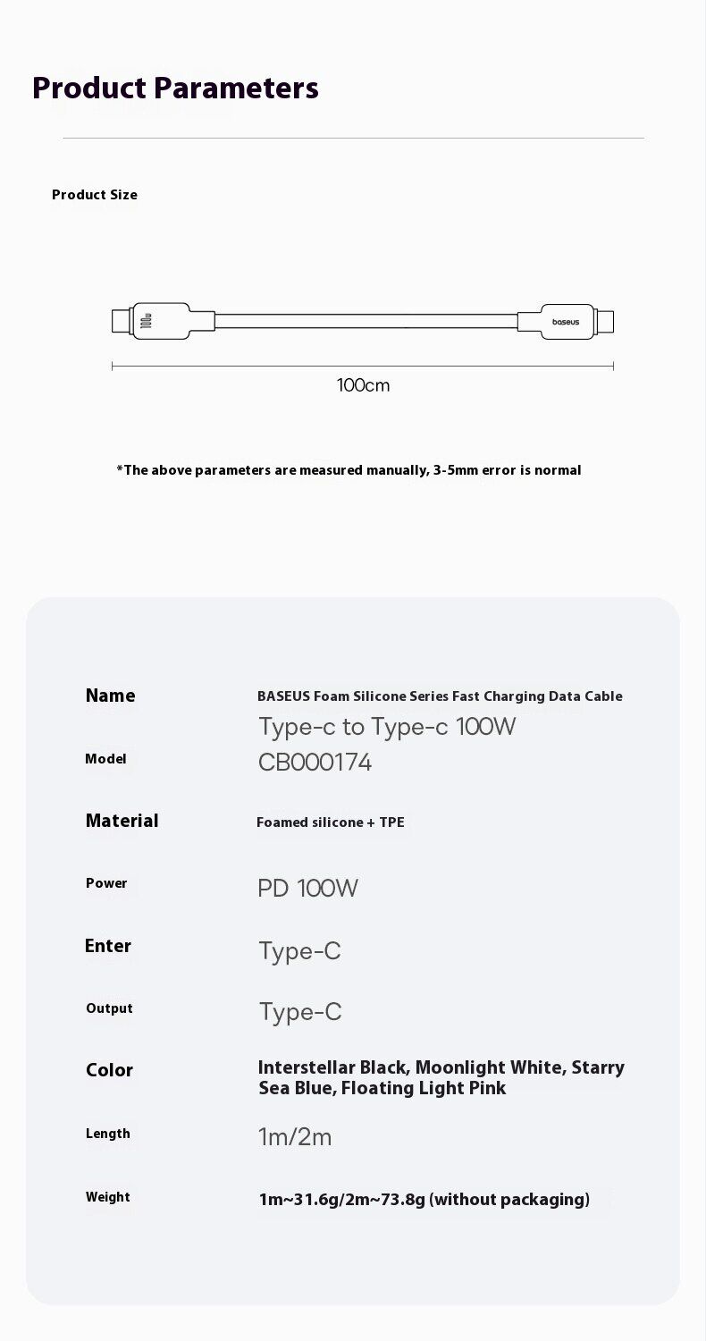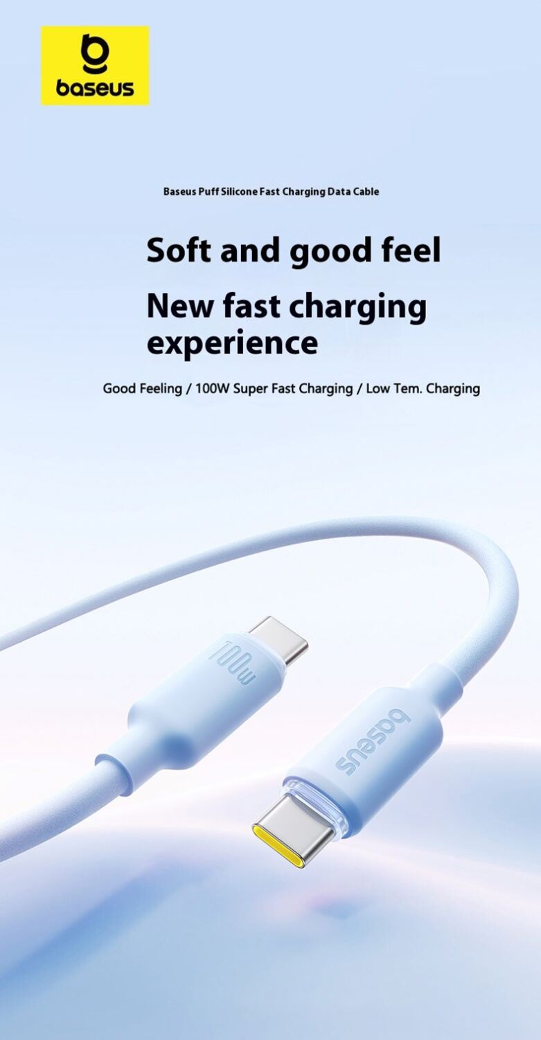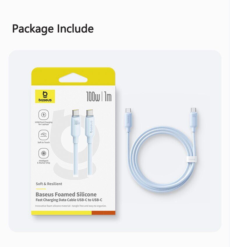 Особливості кабелю Baseus Foamed Silicone Type-C to Type-C (100W, 6A, 1m):