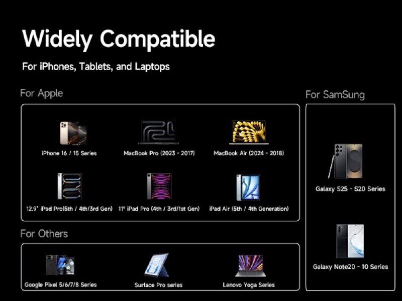 • Потужність до 100 Вт дозволяє швидко заряджати навіть енергоємні пристрої, включаючи ноутбуки;