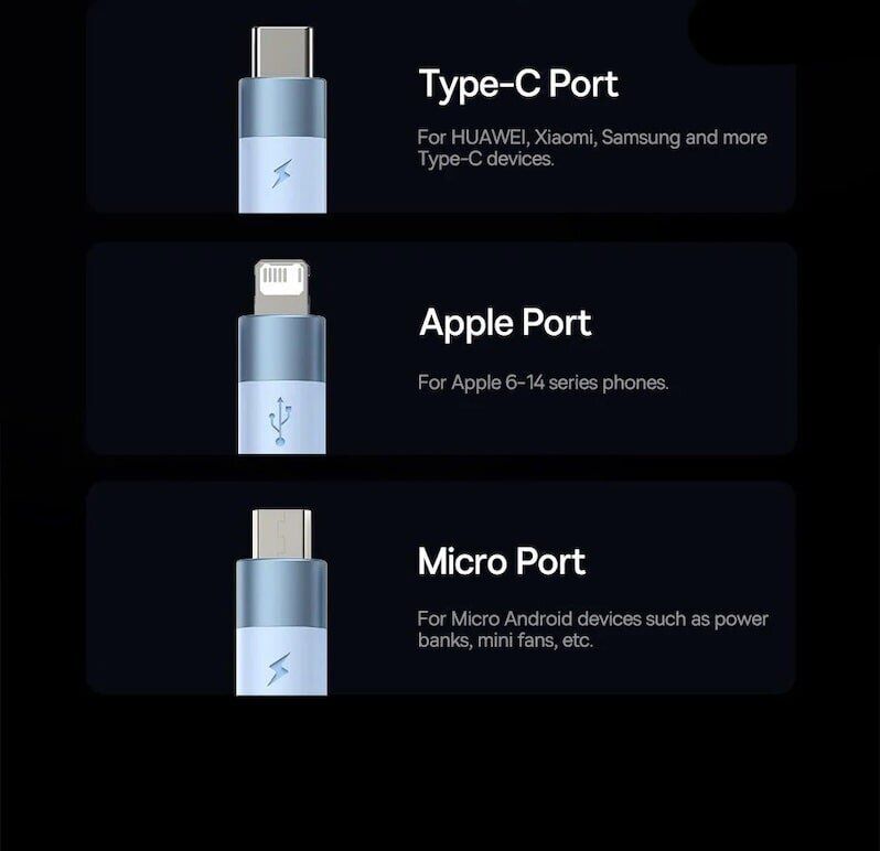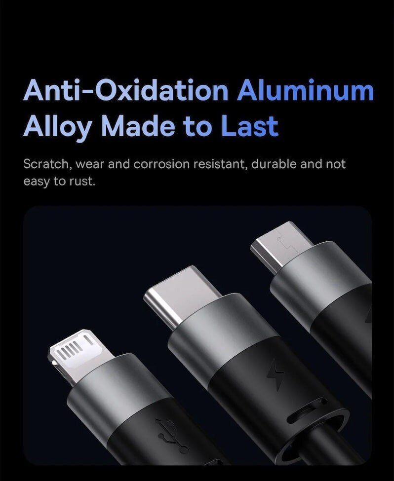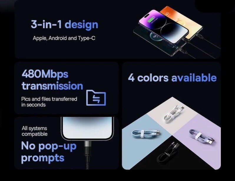- Підтримка трьох популярних роз'ємів - MicroUSB, Lightning і Type-C, що робить кабель універсальним для більшості сучасних пристроїв;