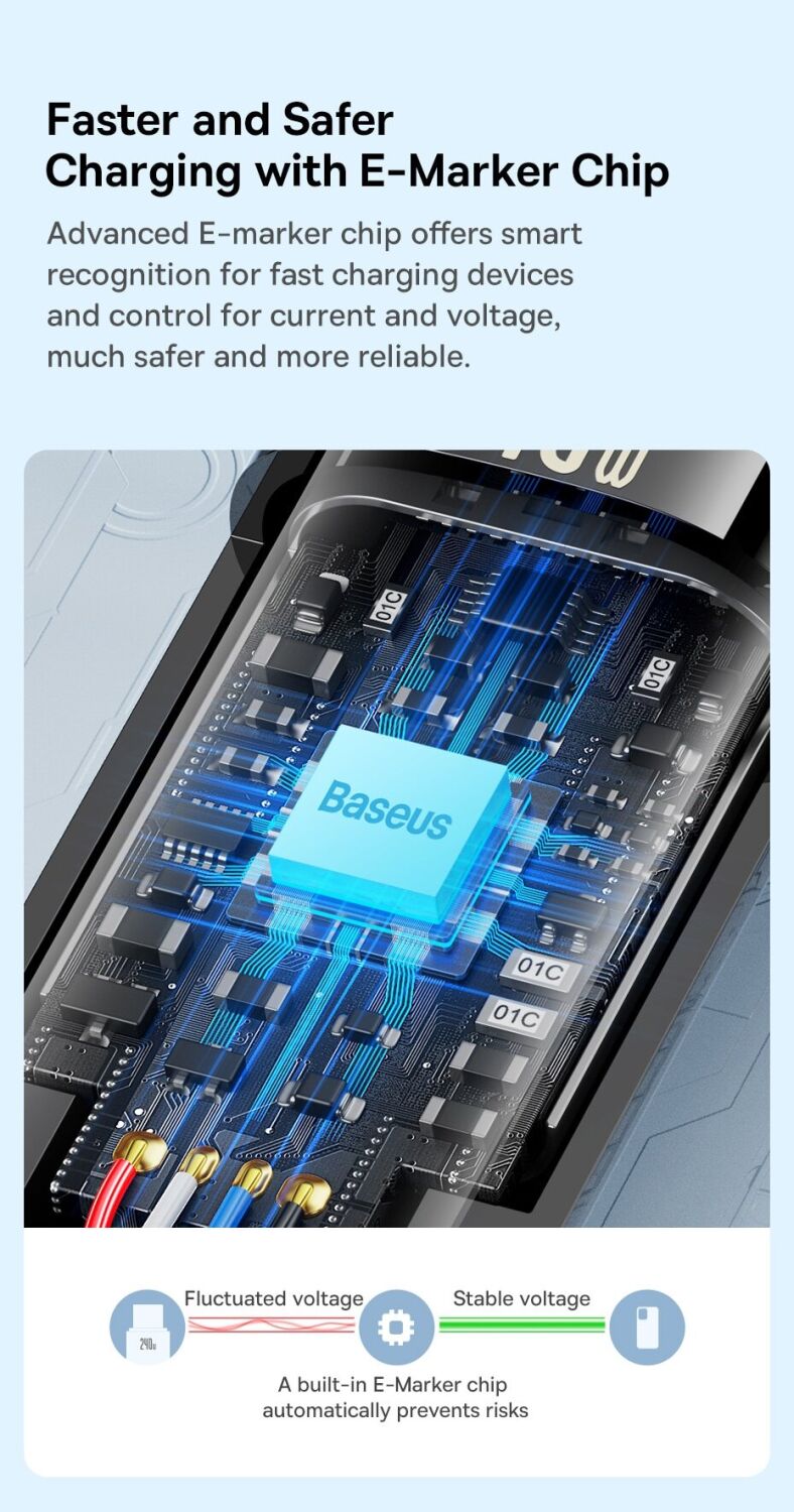 • Інноваційна технологія E-marker дозволяє кабелю автоматично ідентифікувати потужність пристрою та регулювати зарядку, щоб забезпечити максимальну ефективність та безпеку;