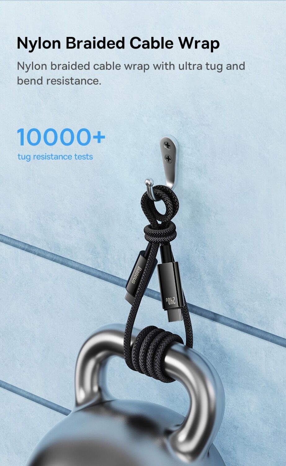 • Зовнішня оболонка кабелю виготовлена з нейлону, який не тільки надає йому елегантного вигляду, але й забезпечує чудову міцність і довговічність;
