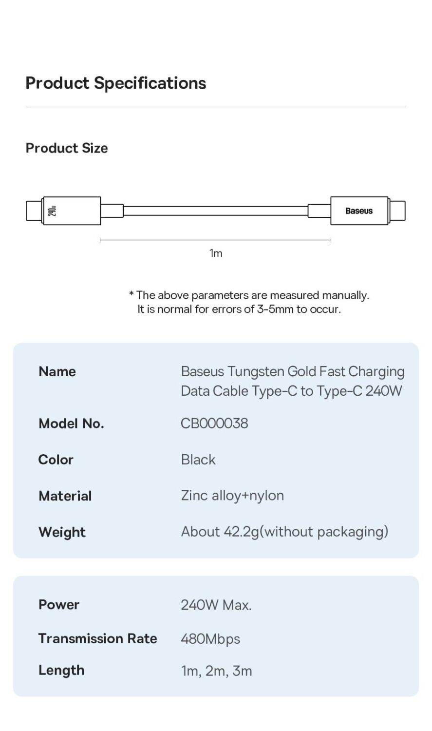 Особливості кабелю Baseus Tungsten Gold Type-C to Type-C 240W (2m) CAWJ040101: