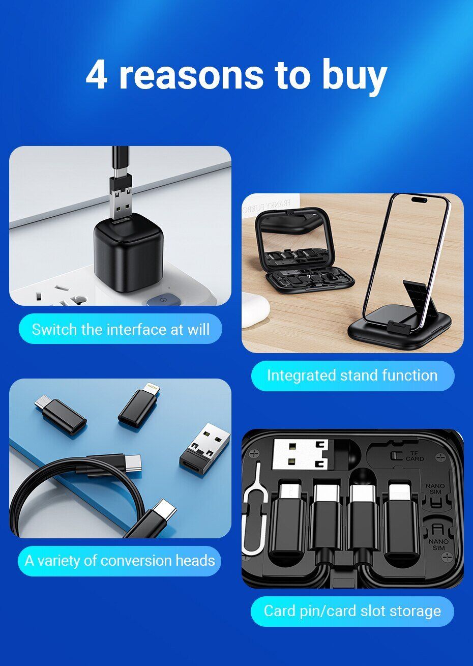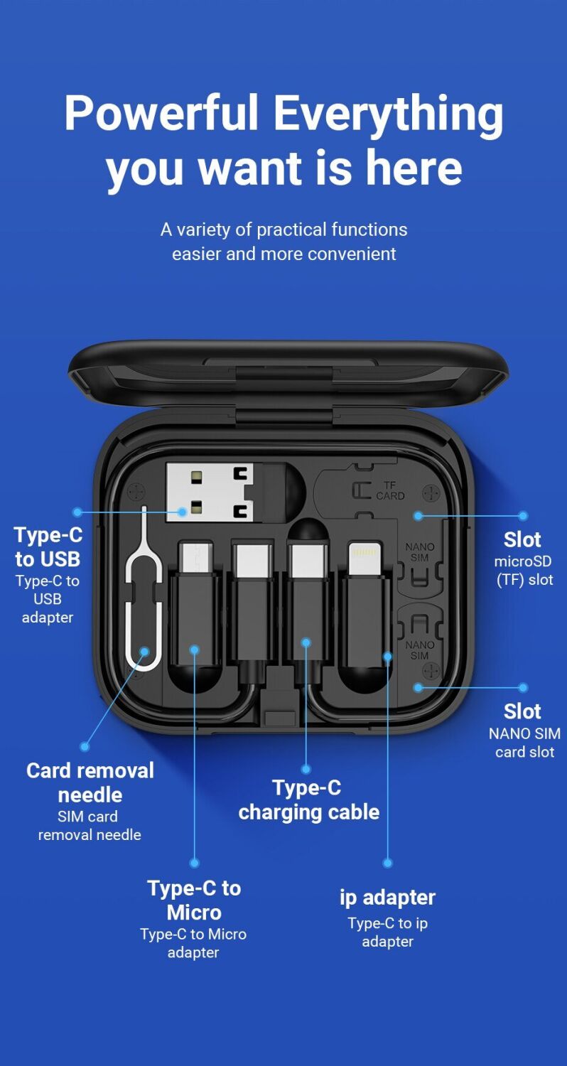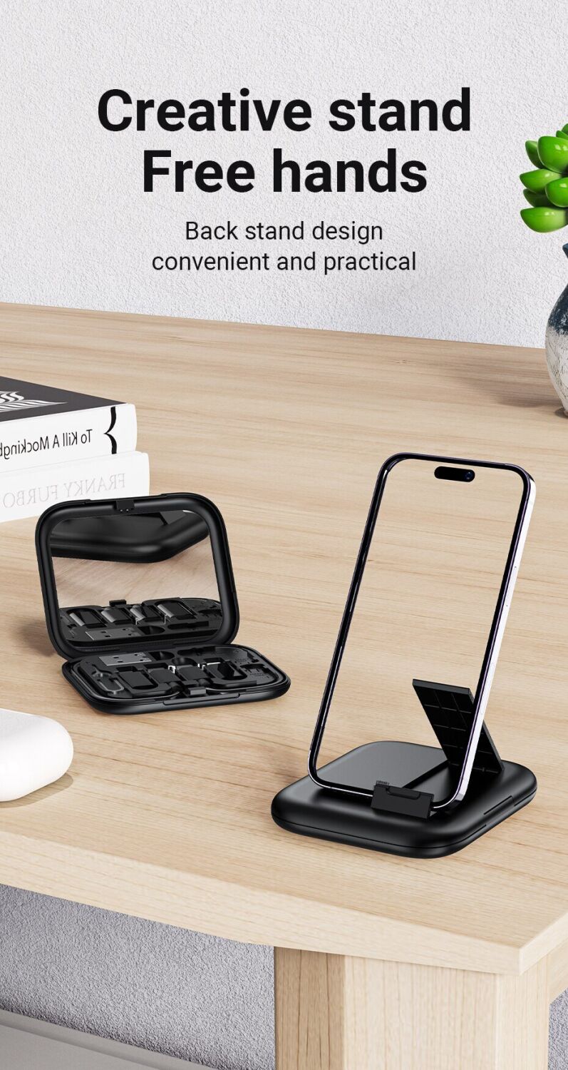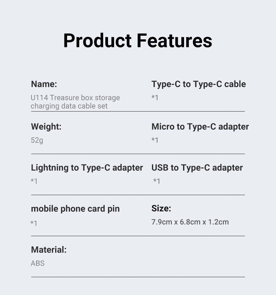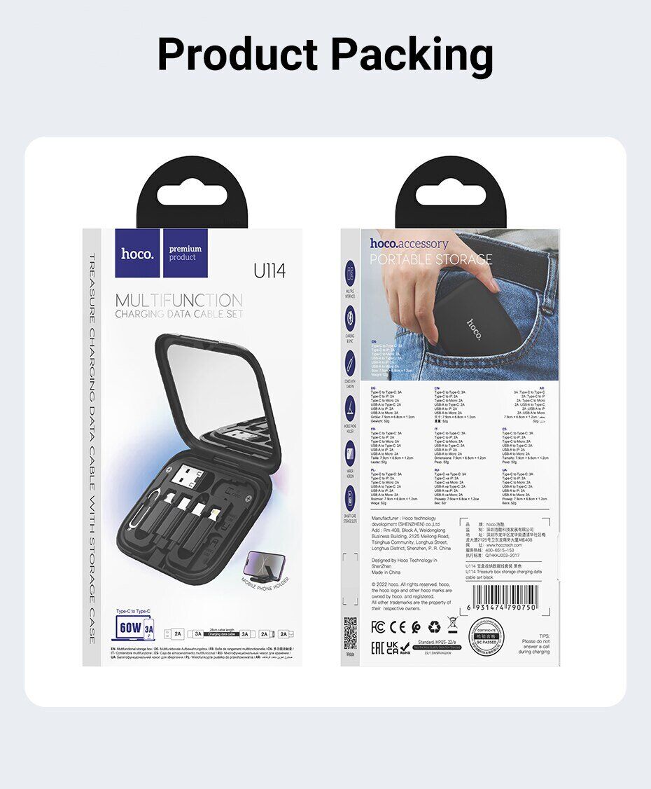 Кабель з комплектом адаптерів Hoco U114 Treasure – одна з кращих пропозицій на ринку мобільних аксесуарів, що поєднує кабель Type-C – Type-C, три перехідники та скріпку для вилучення SIM-карти, поміщені в компактний футляр зі слотами для зберігання картки пам'яті та сім-картки. Кейс дозволяє зі зручністю та повною безпекою брати весь набір із собою у подорожі та відрядження. На його задній панелі є висувний упор, що дозволяє зручно розміщувати аксесуар під кутом і використовувати як підставку для смартфона.
