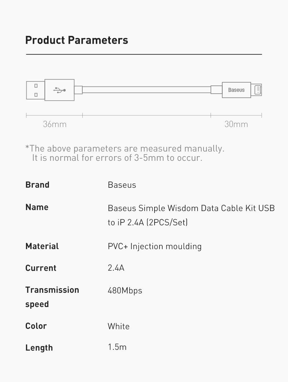 Особливості комплекту кабелів (2шт) Baseus Simple Wisdom USB to Lightning (2.4A, 1.5m) TZCALZJ-02: