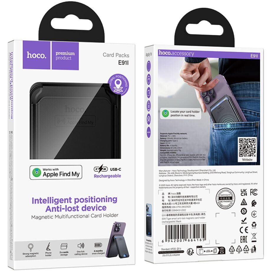 Кардхолдер Hoco E91I — це розумний магнітний тримач для карток із вбудованою функцією захисту від втрати, створений для тих, хто хоче завжди тримати важливе під рукою і швидко знаходити аксесуар через екосистему Apple. Модель підтримує мережу Apple Find My і дозволяє визначати місцезнаходження кардхолдера в реальному часі, що особливо зручно в поїздках, на роботі і в повсякденній метушні. Компактний корпус з PU і ABS виглядає акуратно, приємний на дотик і розрахований на щоденне використання, а тонкий формат не обтяжує смартфон і легко поміщається в кишеню. Завдяки магнітному кріпленню кардхолдер надійно фіксується на задній панелі iPhone і може використовуватися як зручна підставка для перегляду відео або спілкування по відеозв'язку. Вбудований літій-іонний акумулятор ємністю 120 мА·год забезпечує до 4 місяців автономної роботи, тому пристрій не вимагає частої підзарядки. Сумісність заявлена для iOS 14.5 і вище.
