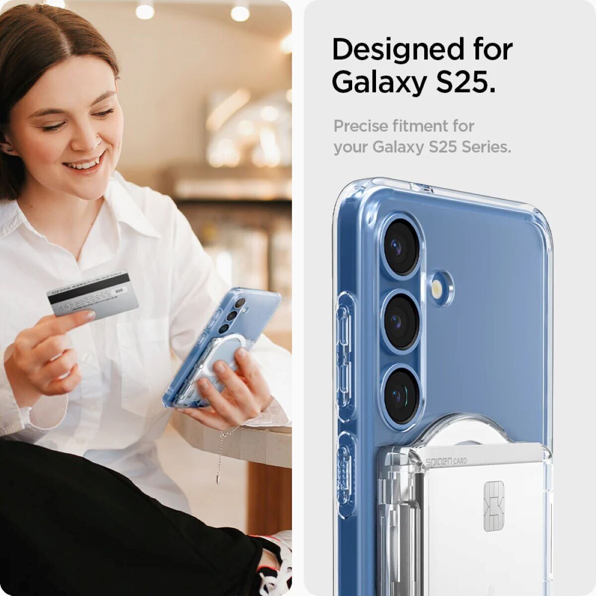 Кардхолдер Spigen Ultra Hybrid (Mag Fit) AFA09206 — практичний і стильний аксесуар для серії Samsung S25 з чохлом MagFit. Модель створена для надійного зберігання банківських і дисконтних карток без потовщення смартфона і зайвих деталей. Прозора основа з міцного полікарбонату гармонійно поєднується з флагманським смартфоном. Аксесуар стійкий до подряпин, не боїться щоденних навантажень і зберігає акуратний зовнішній вигляд з часом. Ергономічна форма і компактні розміри роблять його зручним для носіння в кишені або сумці, а продуманий доступ до карток дозволяє використовувати їх швидко і без зайвих рухів.