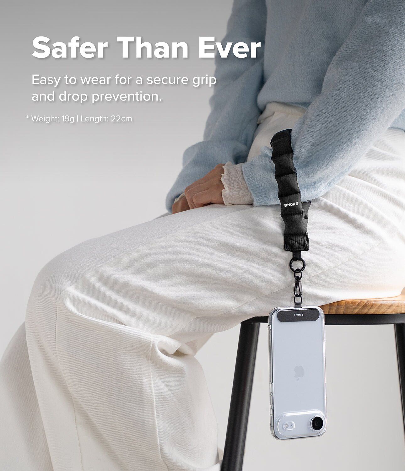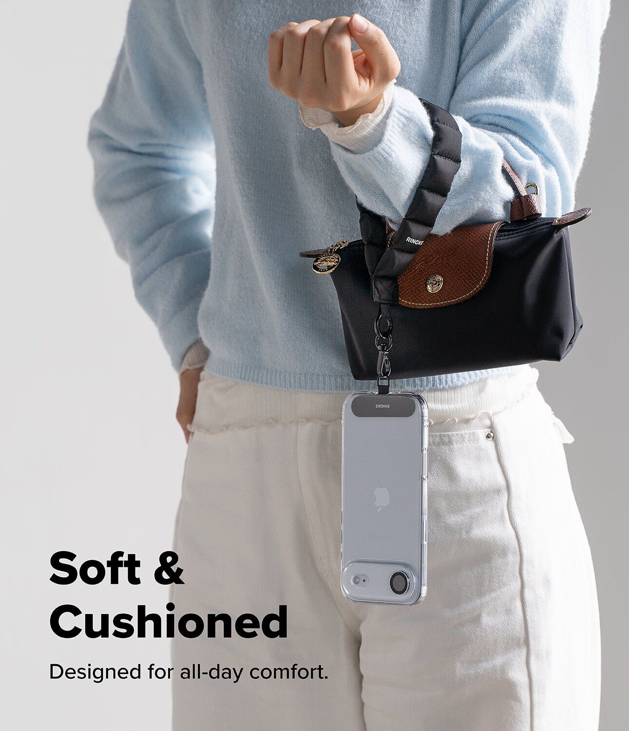 Ремінець для смартфона Ringke Holder Link Puffer — це універсальне рішення для безпечного та зручного користування мобільними пристроями. Комплект включає кріплення Holder Link та м'який ремінець на руку, що забезпечує комфорт під час щоденного використання. Ремінець виготовлений з поліестеру з наповнювачем, завдяки чому він приємно відчувається на зап'ясті та не викликає дискомфорту навіть при тривалому носінні. Міцна конструкція знижує ризик випадкового падіння пристрою. Кріплення Holder Link виготовлено зі зносостійкої нейлонової тканини Oxford, стійкої до розривів і навантажень. Воно встановлюється всередині чохла без використання клею — достатньо розмістити вставку і вивести кріплення через виріз для зарядки. Металевий карабін з поворотним механізмом на 360° забезпечує зручне кріплення і свободу руху, дозволяючи використовувати ремінець з різними аксесуарами. Аксесуар підходить для більшості смартфонів і чохлів, що робить його універсальним рішенням для повсякденного життя, подорожей та активного відпочинку.