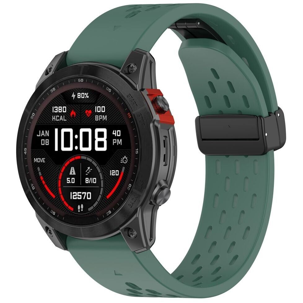 Ремінець Deexe Astra Strap для годинника Garmin з кріпленням QuickFit 22mm виготовлений з преміального силікону з унікальною структурою безлічі отворів, завдяки чому він забезпечує відмінну вентиляцію та комфорт у будь-якій ситуації. Ніжний до шкіри матеріал унеможливлює подразнення та алергії, роблячи його ідеальним для щоденного використання. Стильна магнітна застібка забезпечує легкість в одяганні та зніманні годинника, а також надійно фіксує їх на зап'ясті. Ремінець Deexe Astra Strap є відмінною заміною вашому зношеному або зламаному аксесуару, додаючи елегантності та функціональності вашому годиннику Garmin.
