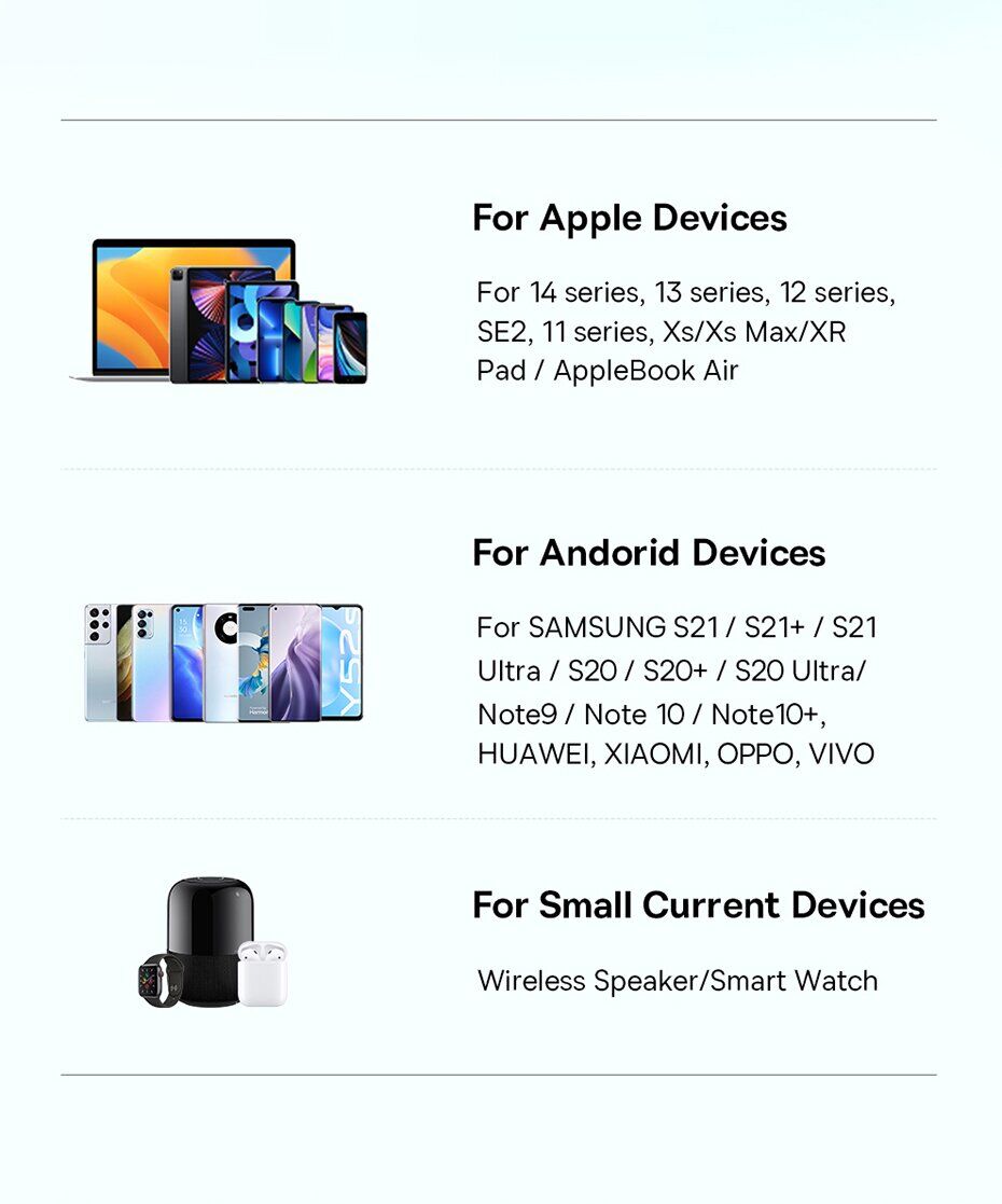 • Поддерживает универсальную совместимость с устройствами Apple, Samsung, Xiaomi, Huawei, Oppo и другими;