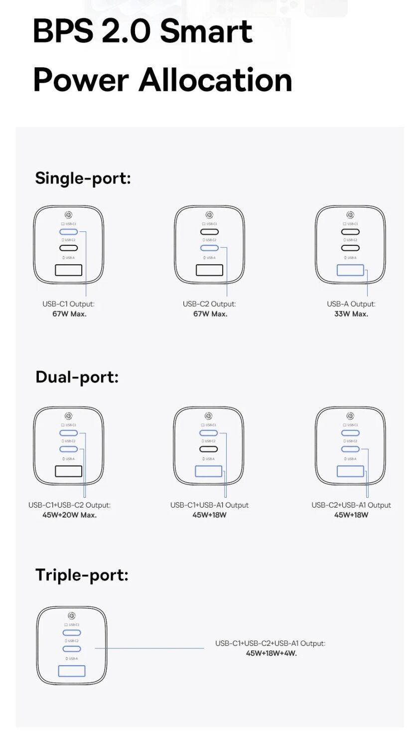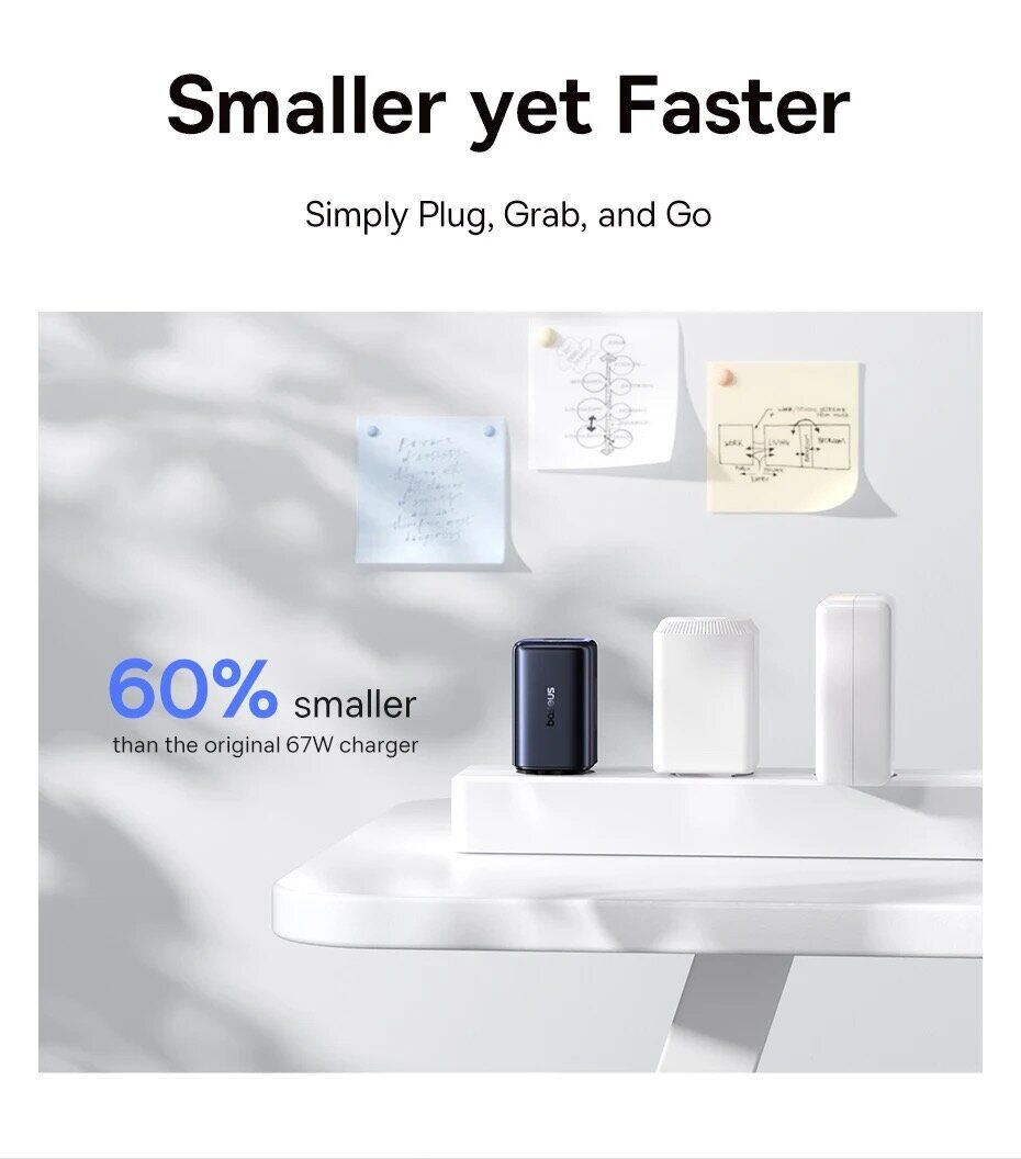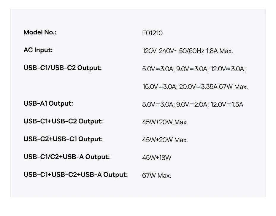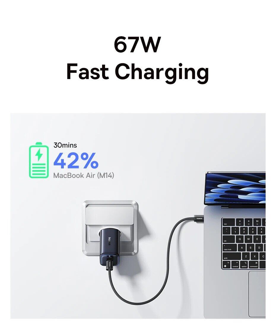 • Мощность до 67 Вт для быстрой зарядки смартфонов, планшетов и ноутбуков;