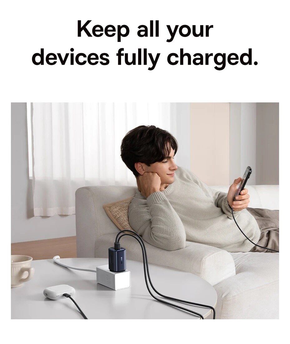 • Три порта: два USB-C и один USB-A для одновременной зарядки;