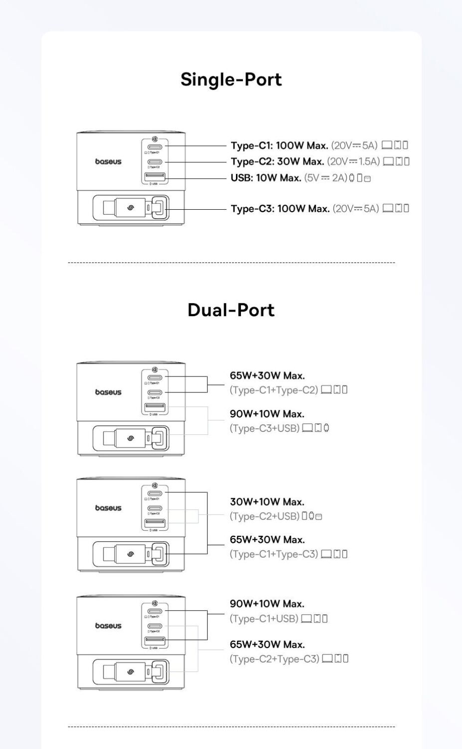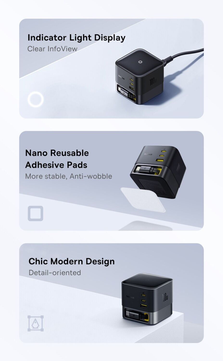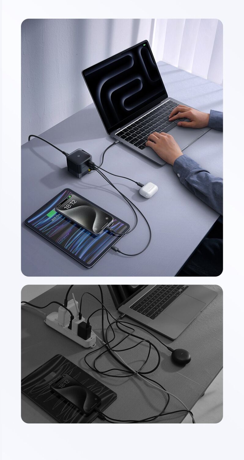 • Максимальная мощность 100 Вт позволяет заряжать ноутбуки, смартфоны и планшеты одновременно, сохраняя стабильное распределение энергии;