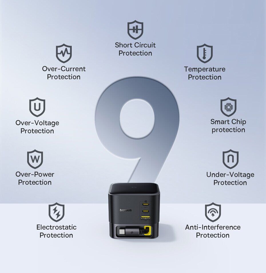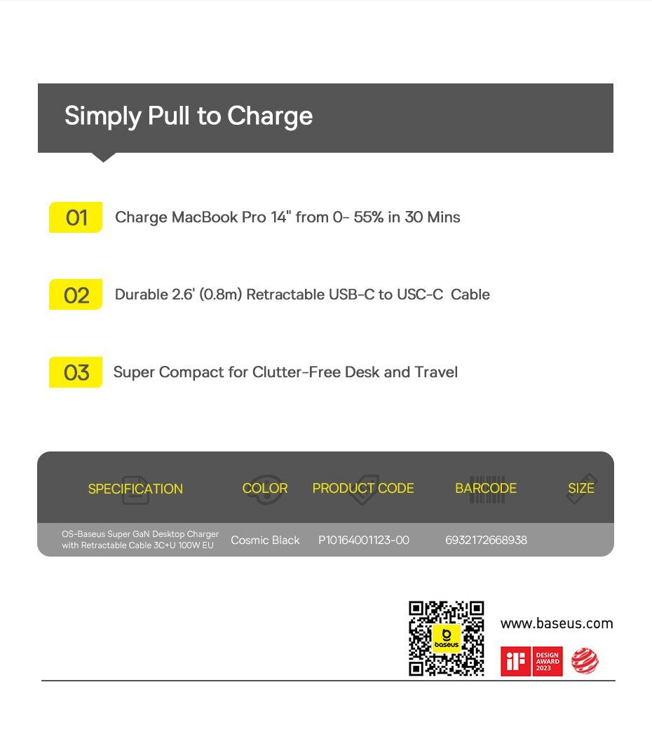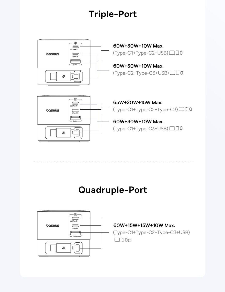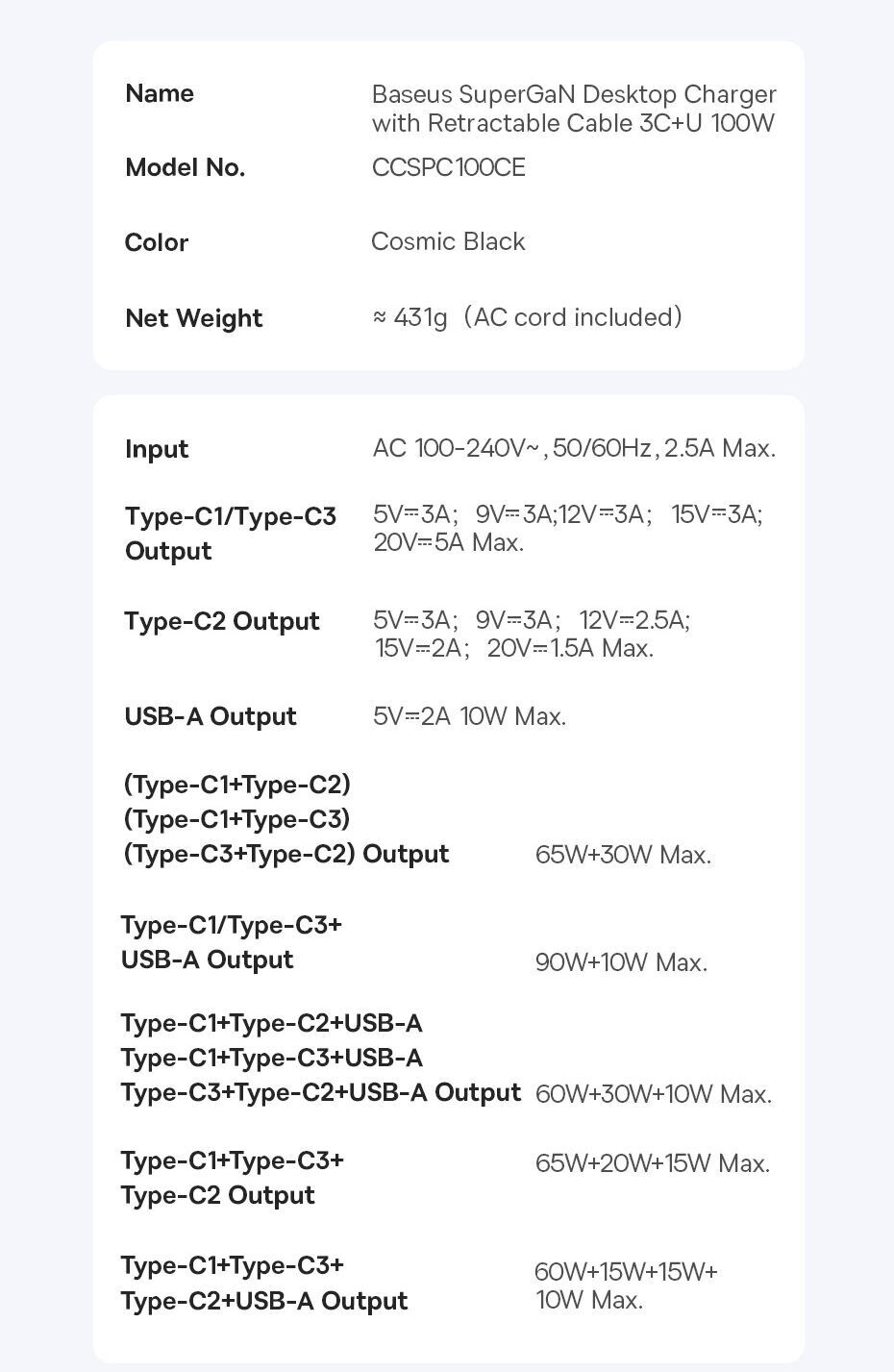 • Максимальная мощность 100 Вт позволяет заряжать ноутбуки, смартфоны и планшеты одновременно, сохраняя стабильное распределение энергии;