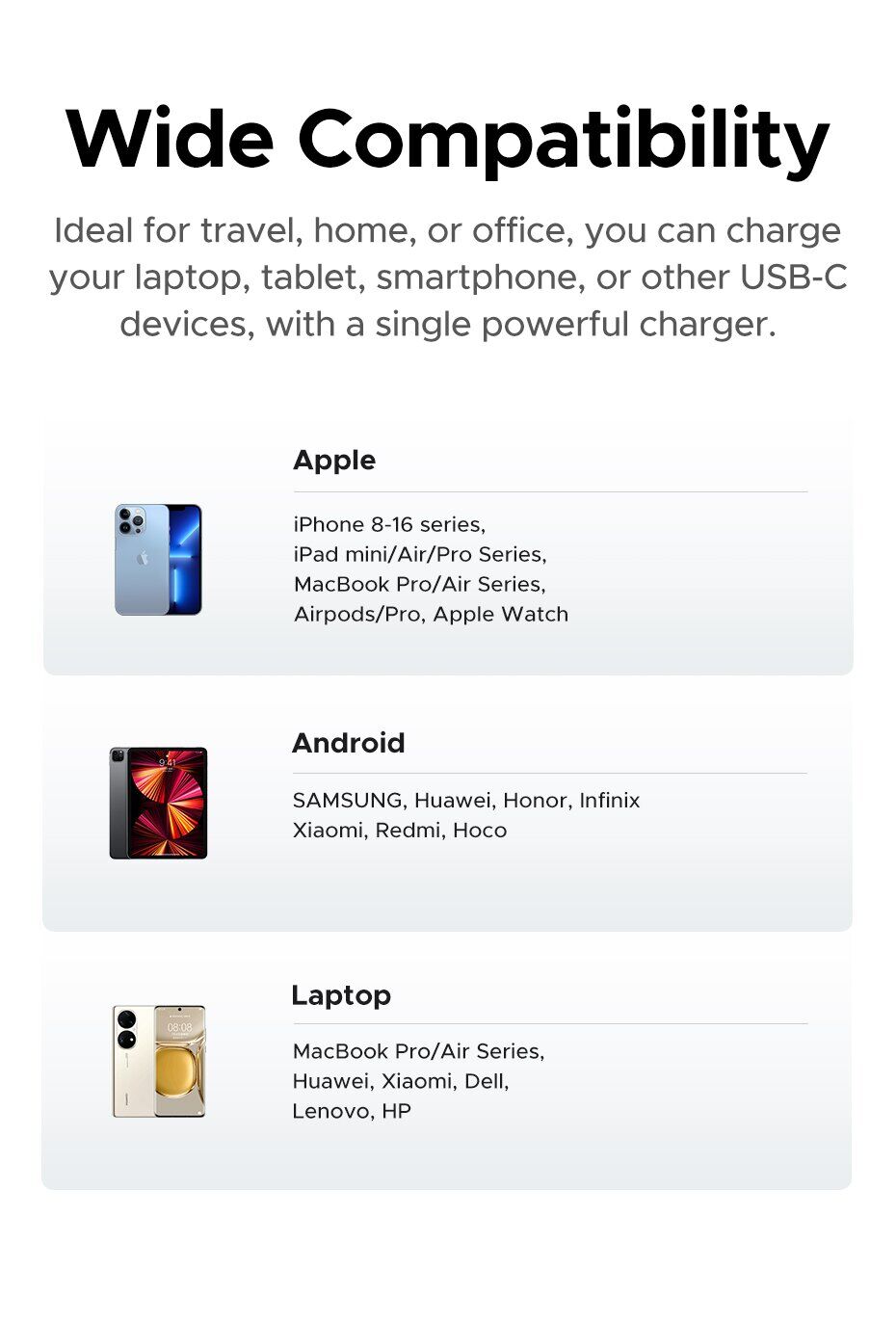 • GaN-технология обеспечивает высокую эффективность, уменьшенный нагрев и компактные размеры адаптера;