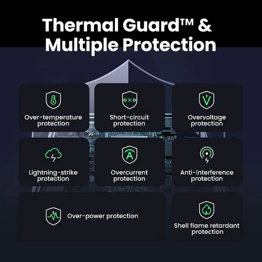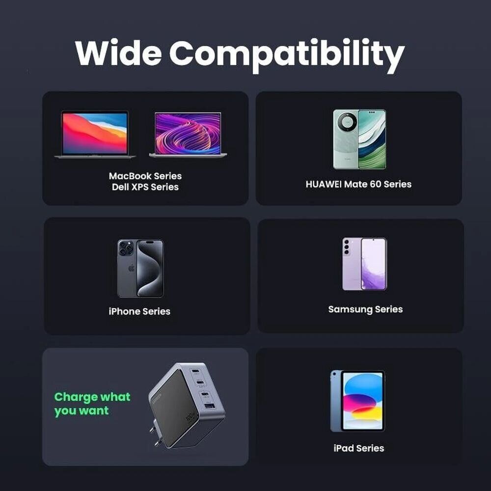 Сетевое зарядное устройство UGREEN X565 Nexode Air GaN 100W 3Type-C + USB (35043) - это мощное и компактное решение для быстрой зарядки смартфонов, планшетов, ноутбуков и других гаджетов. Благодаря современной технологии GaN устройство обеспечивает высокую эффективность работы при меньшем нагреве и занимает минимум места, что делает его удобным для дома, офиса и путешествий. Модель поддерживает широкий спектр протоколов быстрой зарядки, включая PD3.0, QC4+, PPS и другие, поэтому подходит для техники разных брендов. Продуманная система распределения мощности позволяет одновременно подключать до четырех устройств без потери скорости зарядки. Корпус выполнен из прочного ABS-пластика, устойчивого к износу, а встроенные механизмы защиты помогают предотвратить перегрев, перенапряжение и короткое замыкание.